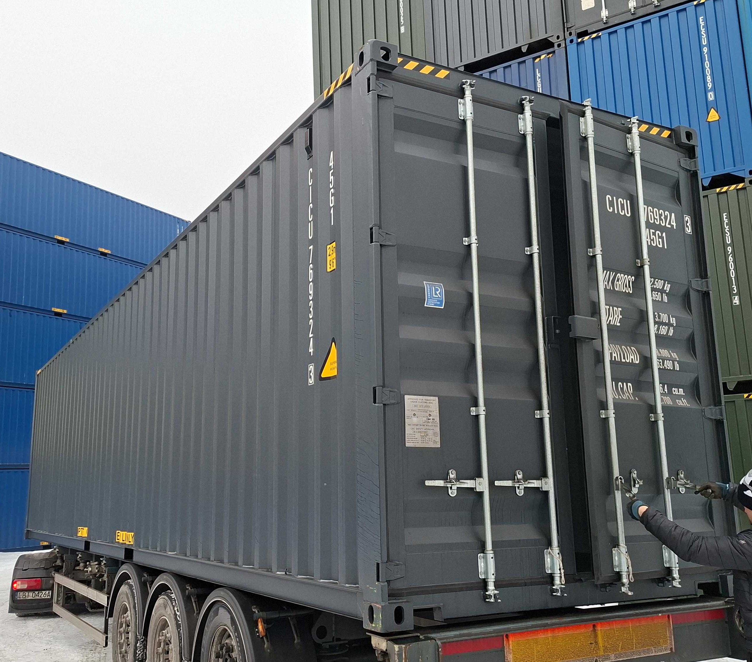 - 40-stopowe kontenery – w tym kontenerze możesz załadować większą ilość towaru do transportu. Klienci często wybierają je jednak do adaptacji na warsztat, garaż, a nawet na przestrzeń biurową.